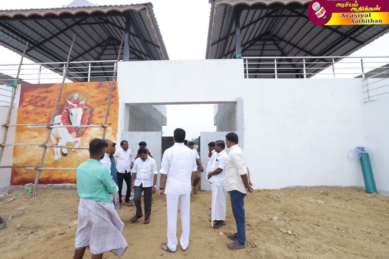 3 கோடியில் பணிகள் நிறைவு தருவாய் எட்டியுள்ள ஜல்லிக்கட்டு மைதானத்தின் நடைபெற்று வரும் இறுதி கட்ட கட்டுமான பணிகளை பார்வையிட்டு விழாவிற்கான ஆயத்த வேலைகளை விரைவு ப்படுத்த கேட்டுக்கொண்டு ஆலோசனைகளை வழங்கிய அமைச்சர் அன்பில் மகேஸ் பொய்யாமொழி.