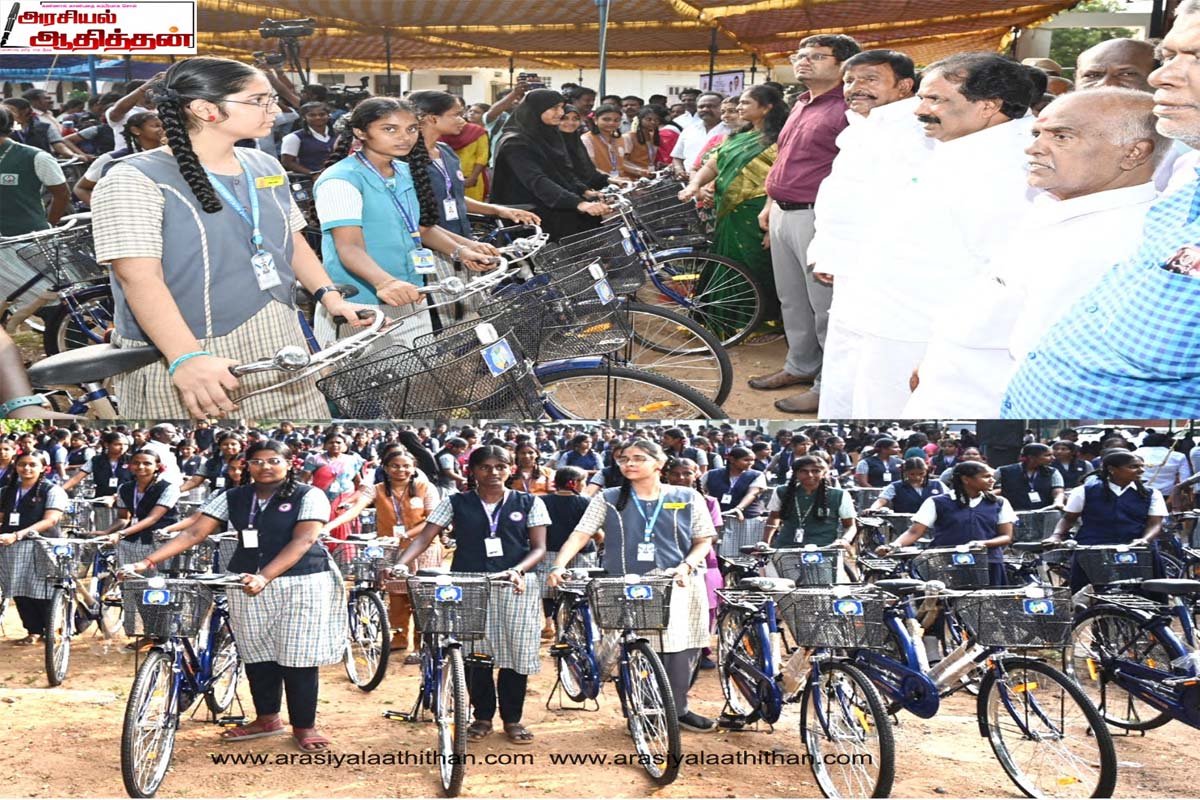 தமிழ்நாடு அரசு மற்றும் அரசு உதவி பெறும் மேல்நிலைப்பள்ளியில் 11 ஆம் வகுப்பு பயிலும் மாணவ, மாணவியர்களுக்கு விலையில்லா மிதிவண்டிகள் ஆண்டுதோறும் தமிழ்நாடு அரசால் வழங்கப்பட்டு வருகிறது. மாண்புமிகு தமிழ்நாடு முதலமைச்சர் திரு.மு.க.ஸ்டாலின் அவர்களின் நல்வாழ்த்துக்களுடன், மாண்புமிகு தமிழ்நாடு துணை முதலமைச்சர் திரு.உதயநிதி ஸ்டாலின் அவர்களால் 2025-26 ஆம் கல்வியாண்டிற்கான அரசு, அரசு உதவி மற்றும் பகுதி நிதியுதவி பெறும் பள்ளிகளில் 11-ஆம் வகுப்பு பயிலும் மாணவ, மாணவிகளுக்கு மிதிவண்டிகள் வழங்கும் திட்டம் குழந்தைகள் தினமான இன்று (14.11.2025) சிவகங்கை மாவட்டத்தில் துவக்கி வைக்கப்பட்டது.ள