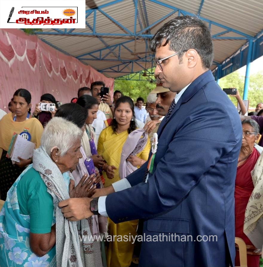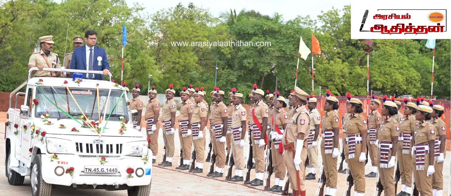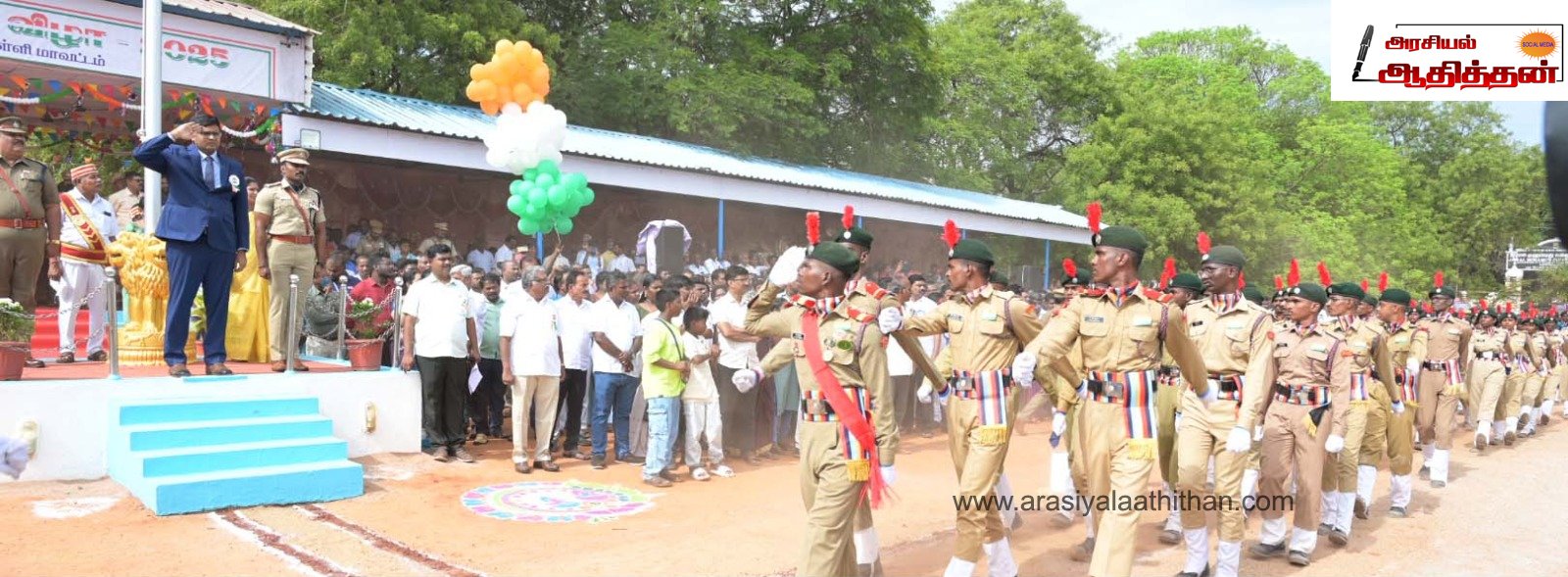 சரவணன் தேசியக் கொடியை ஏற்றி வைத்து காவல் துறையின் வாகனத்தில் அணிவகுப்பு மரியாதை ஏற்றுக்கொண்டார்.